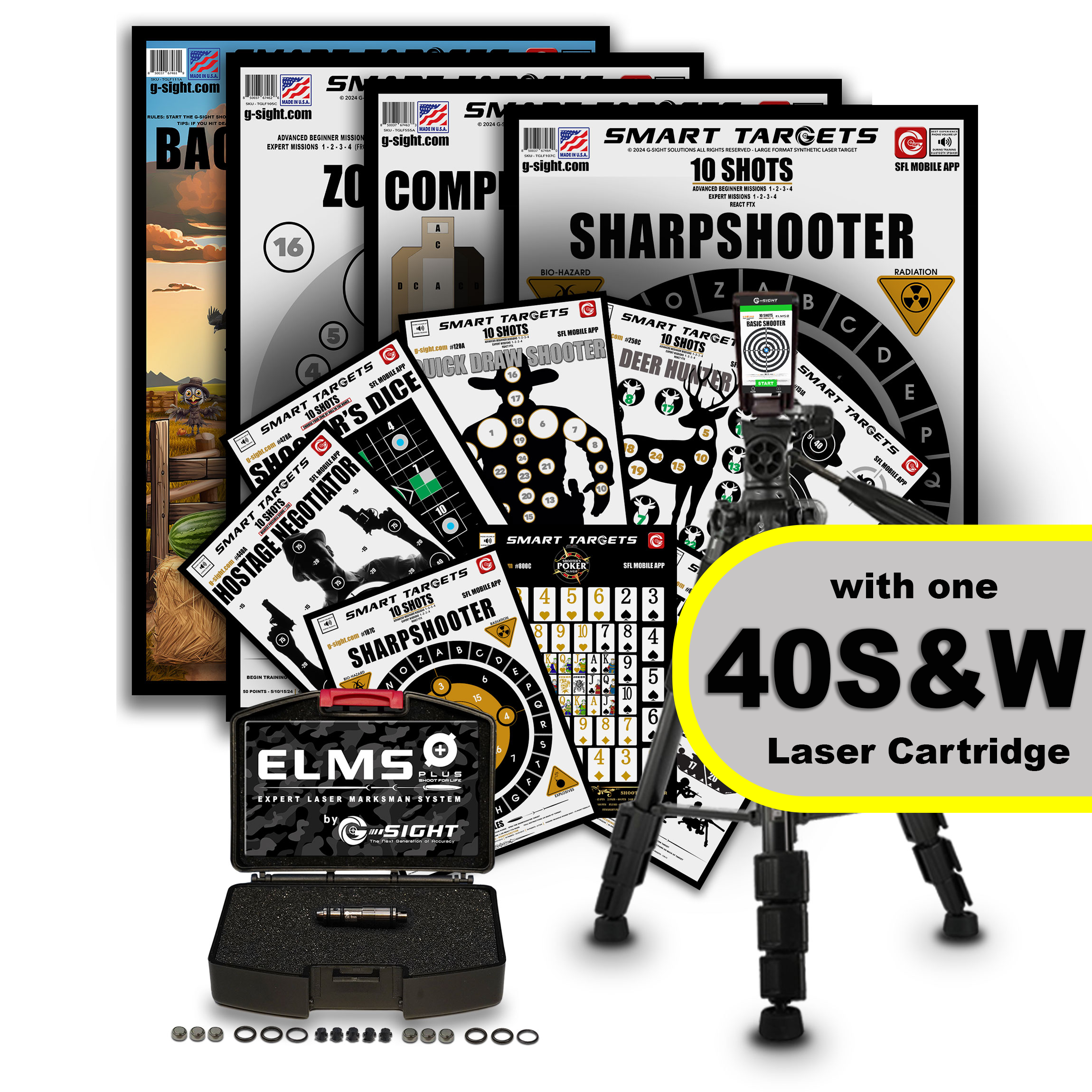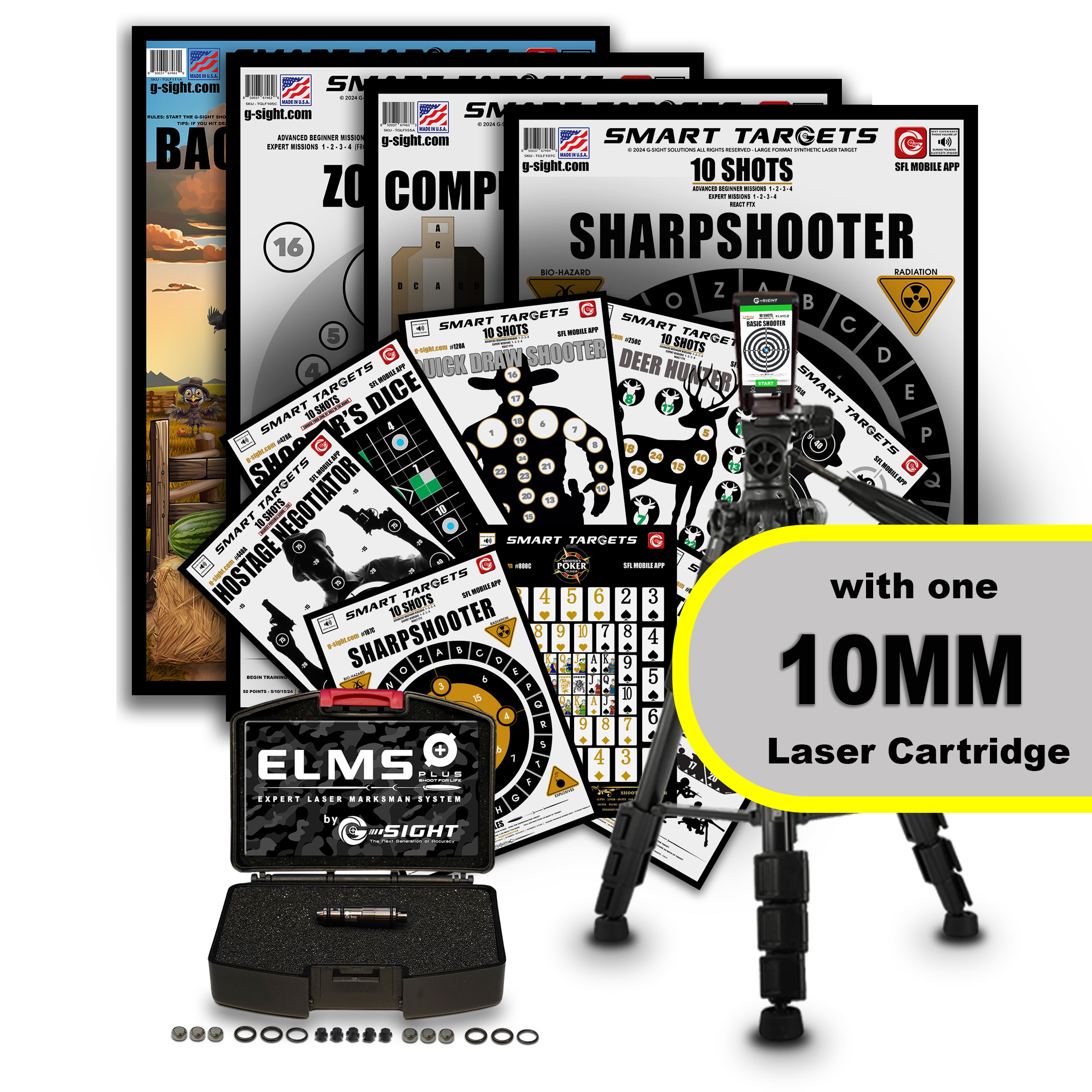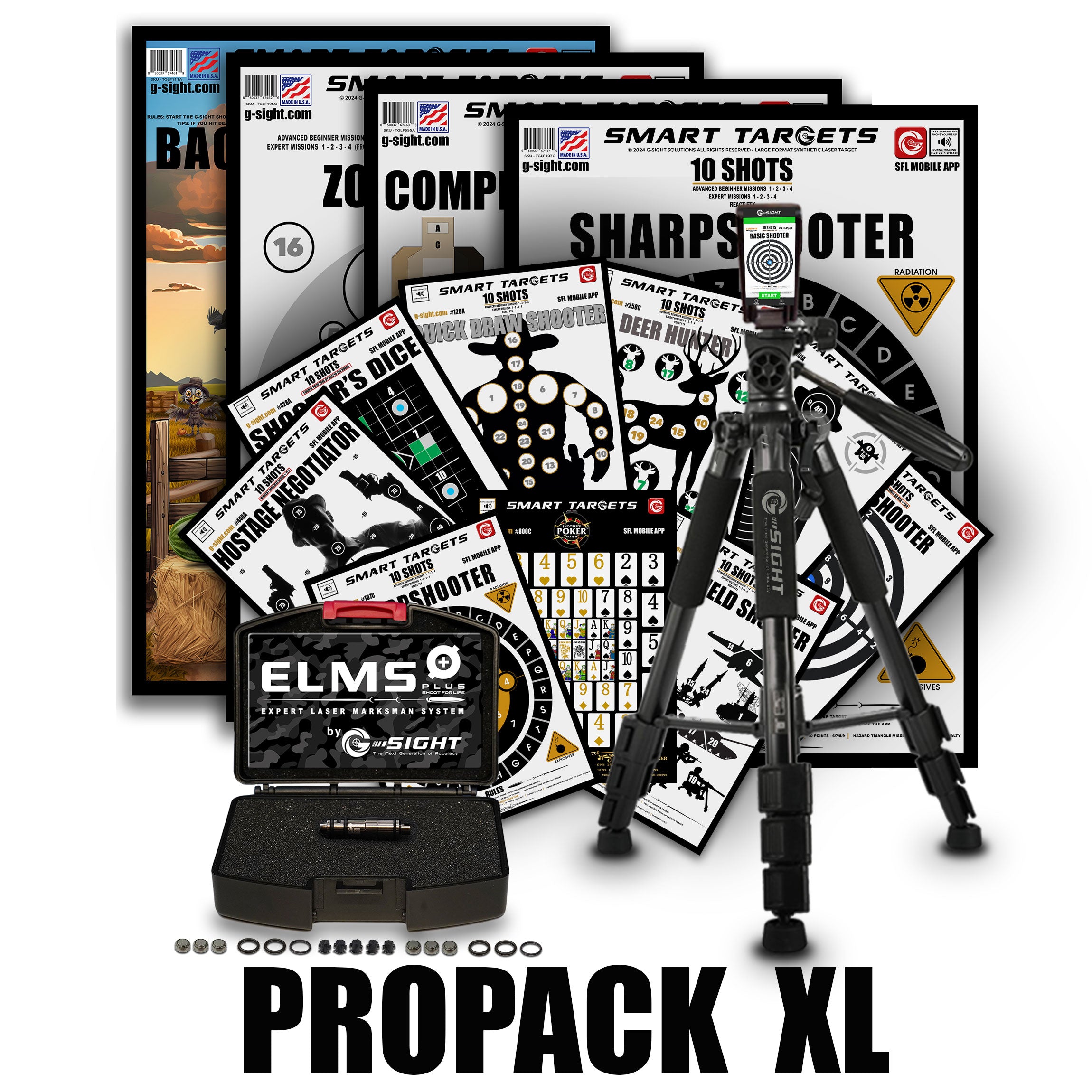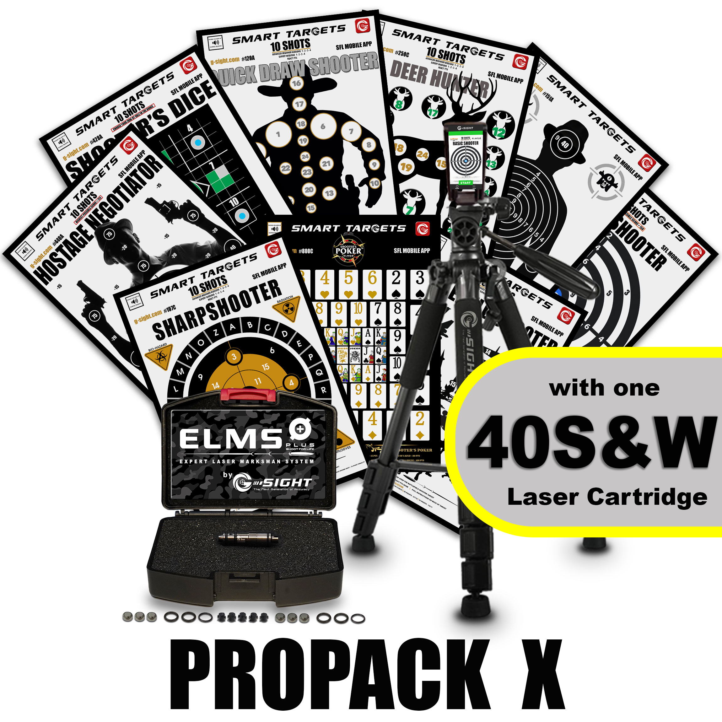 WHAT'S INCLUDED IN THE PROPACK XL: ELMS PLUS Laser Cartridge, PRO Tripod and Phone Holder, Auto Programmed app enabled 4 PACK 19" x 27" LARGE FORMAT SYNTHETIC PLASTIC SMART TARGETS includes; ZONE SHOOTER, COMPETITIVE SHOOTER, SHARPSHOOTER, BACKYARD SHOOTER. Our 9 PACK 11" x 15.5" SMART TARGETS including; BASIC SHOOTER TARGET, HOSTAGE NEGOTIATOR, BATTLEFIELD SHOOTER, QUICK DRAW SHOOTER, DEER HUNTER, SHOOTERS POKER, SHOOTERS DICE, SHARPSHOOTER, THE ORIGINAL 10 SHOT, 2 Sets of O-Rings, 6 Replaceable Rubber Strike Pads, FREE SFL Mobile App (download for ios and Android; requires iOS 10.0 / Android 6.0 or newer). For Indoor Shooting