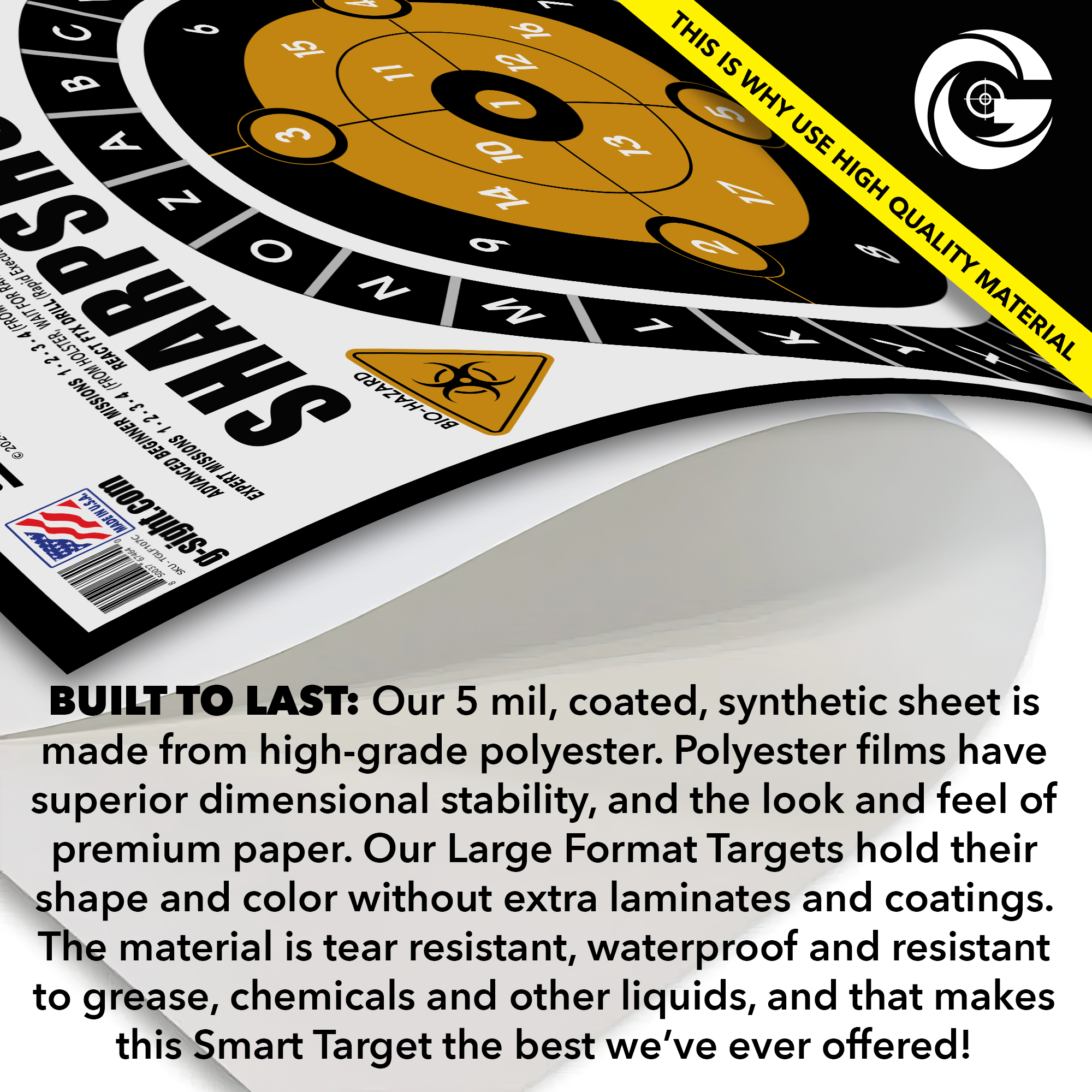Designed with longevity and performance in mind, these targets are printed on a unique 5mm Synthetic Composite Plastic, ensuring unmatched durability and a "Built to Last" quality. The innovative material boasts a LAY FLAT MEMORY feature, allowing the target to unroll from its packaging into a perfectly flat sheet ready for immediate use.