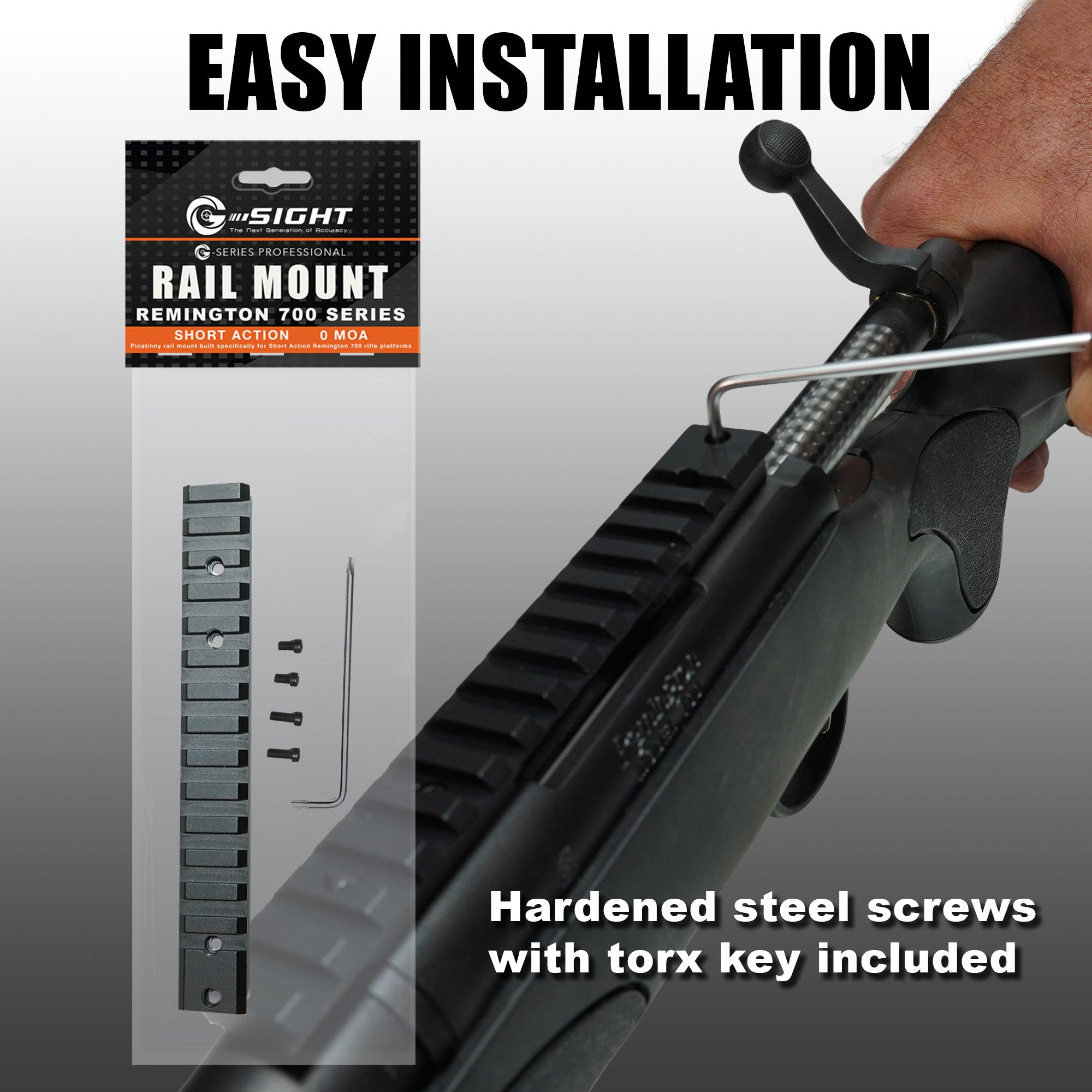 G-Sight's Professional Series rail mount Includes; one set of 4 hardened steel screws and a torx wrench.