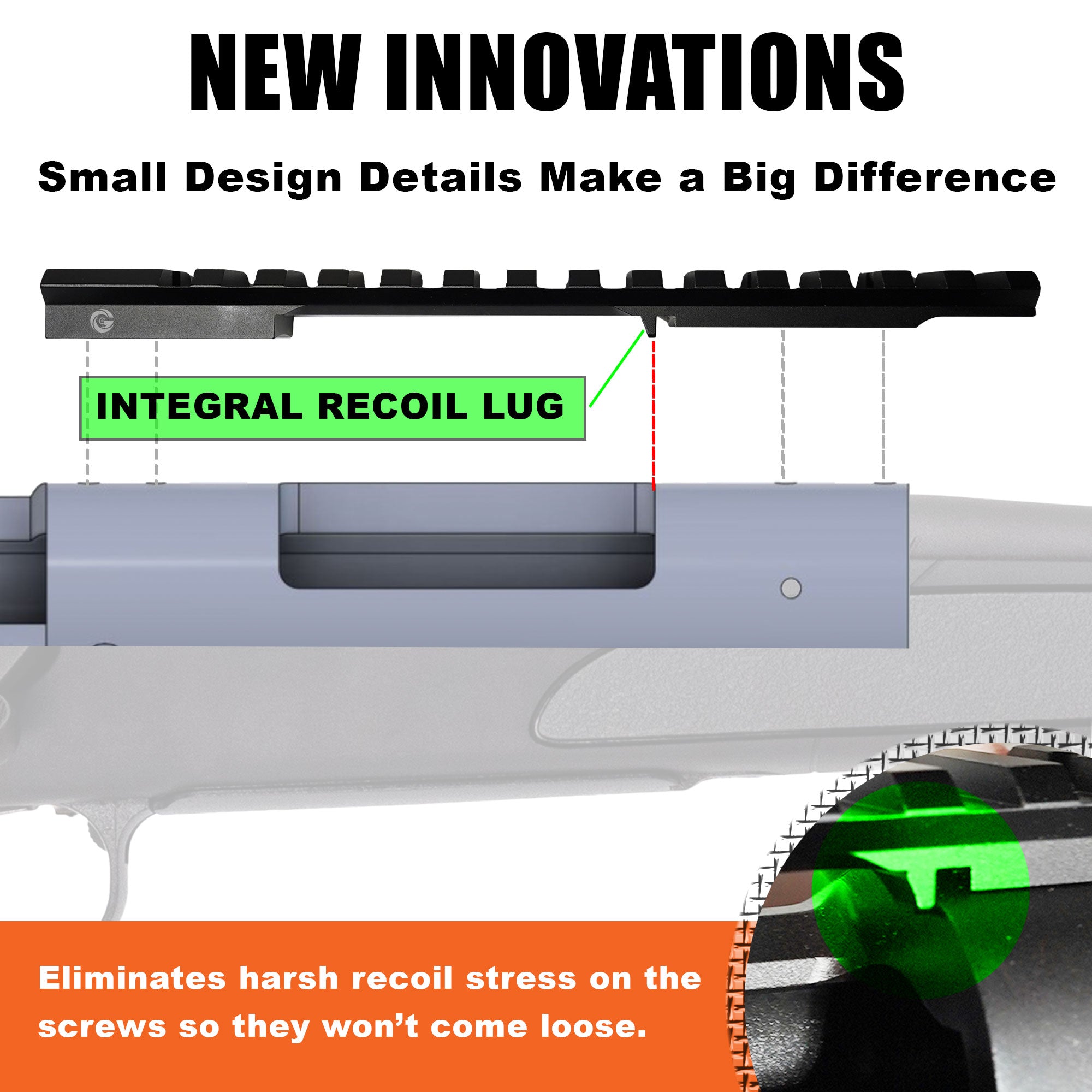 • DESIGNED TO STAY ACCURATE: The internal recoil lug reduces the harsh recoil stress on screws which prevents them from loosening and the rail from moving. In addition, a true military NATO/Picatinny spec interface eliminates errors when attaching rings and optics and further prevents loss of zero from harsh conditions in the field such as bumps, jolts and impacts.